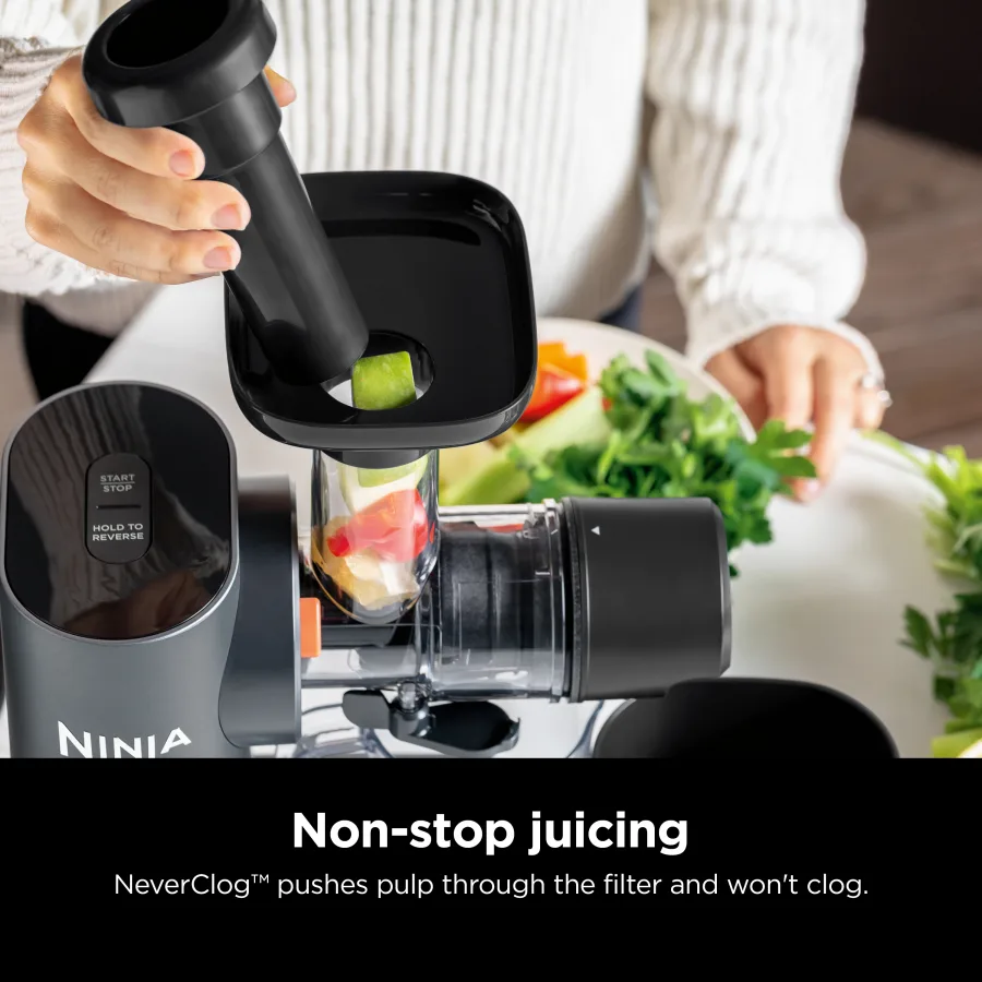 عصاره گیر حرفهای نینجا مدل JC151 از قدرت و نیروی بالایی برخوردار بوده و از طریق مواد سخت برای آبمیوه گیری قوی و بدون وقفه، مهندسی شده است. بر روی بدنه دو دکمه Start/Stop و Reverse به چشم می خورد و امکان چرخش معکوس هنگام آب گیری را نیز دارد. بعد از آب گیری می توانید دکمه REVERSE را بزنید تا تمام باقی مانده مواد را هم آب گیری کند. با این کار نوشیدنی غلیظ تری را تحویل تان می دهد.